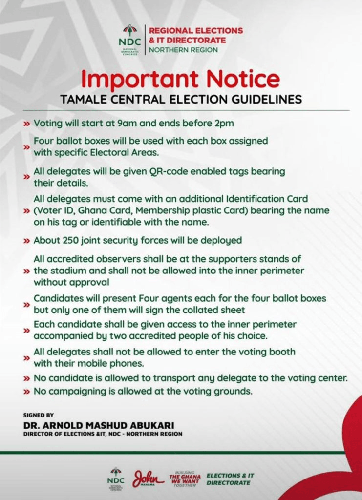 The Northern Regional Directorate of Elections and IT of the National Democratic Congress (NDC) has released key guidelines for the Tamale Central parliamentary primary scheduled for Saturday, September 6, 2025.
